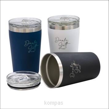 Duurzame dubbelwandige thermosbeker gemaakt van gerecycled roestvrij staal.